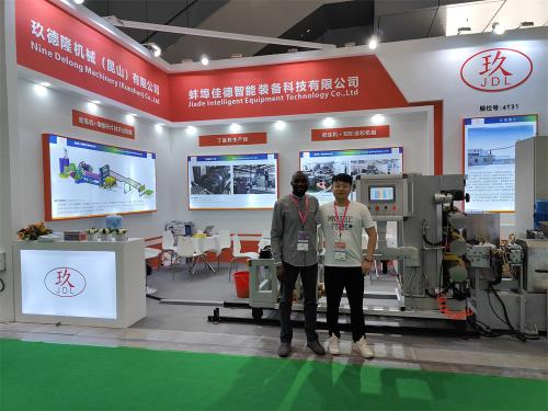 制品厚度:1-3mm 物料比重:1.7-2.0產(chǎn) 隔音片材擠出機(jī)_POE隔音片材擠出機(jī)_佳德 能:14~17噸/24小時 注意事項:取決于客戶的配方、工藝、生產(chǎn)條件客戶為何購買我們設(shè)備,我們價位在行業(yè)屬于中低價格,我們設(shè)備能給客戶帶來哪里利益,我們設(shè)備能給用戶帶來以下利益:1.特點(diǎn):這套設(shè)備主機(jī)是環(huán)保型;主機(jī)設(shè)備不需要接外循環(huán)水系統(tǒng);自帶循環(huán)冷卻統(tǒng)是我公司專利產(chǎn)品,2.齒輪箱冷卻采用:采用環(huán)保冷卻系統(tǒng)(環(huán)保型:發(fā)明專利號:CN201911312134.6)不需要接外循環(huán)水冷卻,不用徘外水;采用閉環(huán)循環(huán)系統(tǒng),不用擔(dān)心長時間使用水冷卻會產(chǎn)生水垢把冷卻器堵住,導(dǎo)致齒輪箱損壞3.主機(jī)水箱冷卻系統(tǒng)采用:采用環(huán)保冷卻系統(tǒng)(環(huán)保型:發(fā)明專利號:CN201911312134.6)不需要接外循環(huán)水冷卻,不用徘外水;采用閉環(huán)循環(huán)系統(tǒng)4.節(jié)能:普通筒體筒體冷卻;例如:第5區(qū)溫度超高;這是電子閥導(dǎo)通;第5區(qū)冷卻回水就會影響第六區(qū)和第四區(qū)的溫度下降;就會導(dǎo)致第四六區(qū)加溫;這種情況會一直循環(huán)出現(xiàn);導(dǎo)致電費(fèi)浪費(fèi);我們現(xiàn)在采用環(huán)保型就徹底解決這個問題;加我們委托第三方開發(fā)溫控模塊,溫控加熱系統(tǒng)比同類設(shè)備節(jié)能:10-20%電費(fèi),就是每噸能為客戶節(jié)省電費(fèi)10元,每年大概能節(jié)約電費(fèi)3萬二. 隔音片材擠出機(jī)_POE隔音片材擠出機(jī)_佳德技術(shù)配置(三)錐雙強(qiáng)制喂料機(jī):一臺 1)電機(jī)功率:15kw,采用“三晶或羅賓漢”變頻調(diào)速器。喂料螺桿:錐形雙螺桿強(qiáng)制下料,